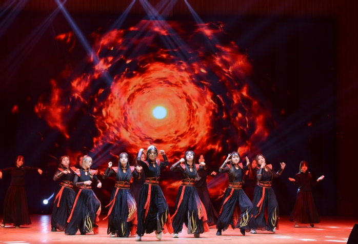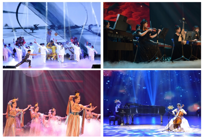 《龙狮献瑞武华章》将礼堂的气氛瞬间点燃,晚会正式拉开序幕。器乐合奏《云宫迅音》、舞蹈《无畏少年》生动展现了时代青年的新力量,钢琴独奏《张帅三首前奏曲之三》、大提琴独奏《冬的浪漫》、琵琶独奏《送我一支玫瑰花》,优美的旋律让人陶醉其中。敦煌舞《沁莲》带领观众感受敦煌艺术的无限魅力,领略传统文化的生生不息……