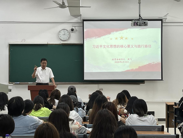 6月10日下午,校党委副书记周飞以“习近平文化思想的核心要义与践行路径”为题,为24级产品设计专业学生授课。他从文化的概念与价值切入,阐释习近平文化思想的生成逻辑、科学内涵,强调其作为新时代党领导文化建设实践经验的理论总结的重要意义。通过列举习近平总书记考察历史文化场馆等实例,结合学校文化建设实际,他鼓励学生坚定文化自信,参与文化传承创新,从中华优秀传统文化中汲取养分,讲好中国故事。