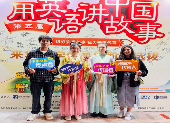 本届大会以“讲好安徽故事,我为安徽代言”为主题,活动分为主题演讲、即兴问答和才艺展示三个环节。我校选派胡京晶(蒙古)、张北星(泰国)、苏蓓夏(尼泊尔)、罗深(尼泊尔)进入高阶选拔,组织专业师资力量对参赛学生进行一对一指导。选手们通过声情并茂的舞台表现,表达了他们对中国传统文化的热爱。