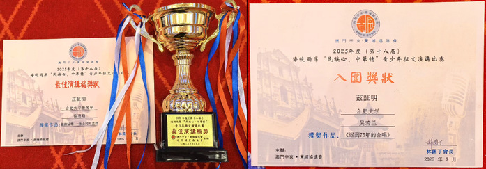 近日,由澳门辛亥•黄埔协进会主办的第十八届海峡两岸“民族心、中华情”青少年征文演讲比赛在澳门举行。我校语言文化与传媒学院徐萌萌和吴若兰代表安徽省大学生参加比赛,徐萌萌荣获“最佳演讲稿奖”,吴若兰荣获“英才奖”。