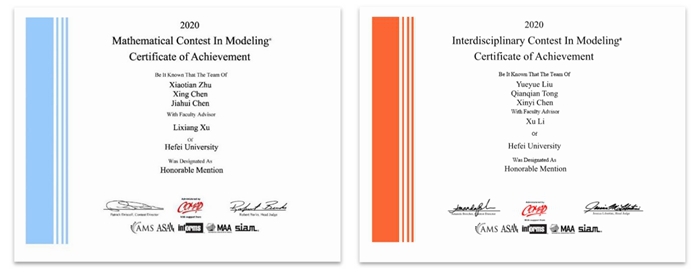 本次比赛中,我校参赛选手信息与计算科学专业朱啸天、陈家辉、陈星小组,自动化专业刘悦悦、陈欣怡、童倩倩小组在人工智能与大数据学院徐立祥、李旭老师的指导下,积极通过在线方式进行小组内部讨论,克服种种困难,在规定时间内共同完成了参赛作品,最终荣获二项H奖(国际二等奖)。