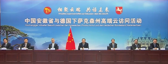 Am 16. Juli hielten die Provinz Anhui und das deutsche Bundesland Niedersachsen eine Videokonferenz zum Thema Virtuelles Zusammentreffen zur Diskussion über die Zukunft — Hochrangiger Virtueller Besuch zwischen der chinesischen Provinz Anhui und dem deutschen Bundesland Niedersachsen ab. An der Veranstaltung nahmen Li Jinbin, Sekretär des Komitees der Kommunistischen Partei der Provinz Anhui, Wang Qingxian, Gouverneur der Volksregierung der Provinz Anhui, Stephan Weil, Niedersächsischer Ministerpräsident, Zhang Xi, Vizegouverneur der Volksregierung der Provinz Anhui, Du Xiaohui, chinesischer Generalkonsul in Hamburg, Thomas Triller, amtierender deutscher Generalkonsul in Shanghai, und Wu Chunmei, Präsidentin der Universität Hefei teil.
