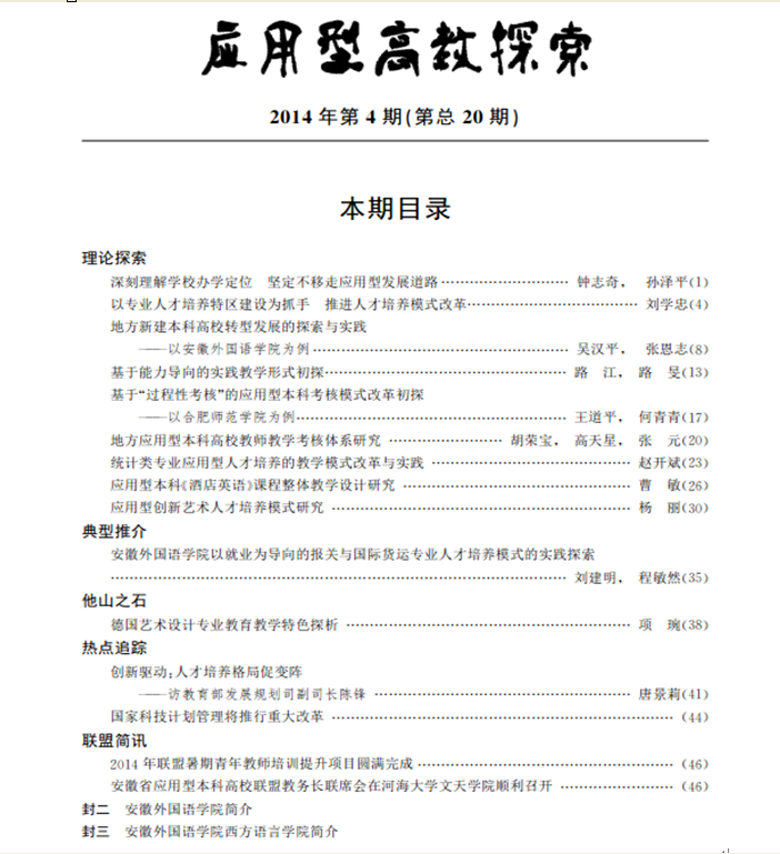 《应用型高教探索》2014年第 4 期(总第20期)已编发,具体内容请查阅发展规划处网站http://www.hfuu.yunmeifei.com/s/85/t/330/p/6/list.htm
