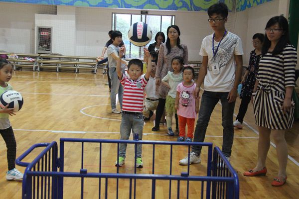孩子们参观校园过后,就到了本次活动最精彩的游戏环节。此次亲子活动按照不同年龄段的儿童进行分组游戏,区分不同的游戏内容。第一组由1-2岁的儿童组成,游戏为“爬爬乐”,孩子匍匐在软垫子上,一步一步爬向终点。在游戏过程中,父母们的不断鼓励使得孩子完成了比赛。第二组由3岁的儿童组成,游戏为“袋鼠跑”,小朋友必须紧紧抱着家长的脖子,首先跑完全程的队伍获胜,考验家长与孩子的默契度。第三组由4-6岁的儿童组成,游戏包括“三人两足”、“定点投球”。游戏中,孩子们充分展示着童真的快乐,在互动中加深孩子与家长的情感。第四组由7-16岁的小朋友组成,游戏包括“运球”、“定点投篮”。孩子们精彩的表现和父母们洋溢在脸上的喜悦相映成趣,欢呼声此起彼伏。在这次的比赛中,孩子们都获得了由学校提供的荣誉证书和精美的礼物,