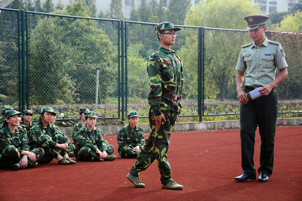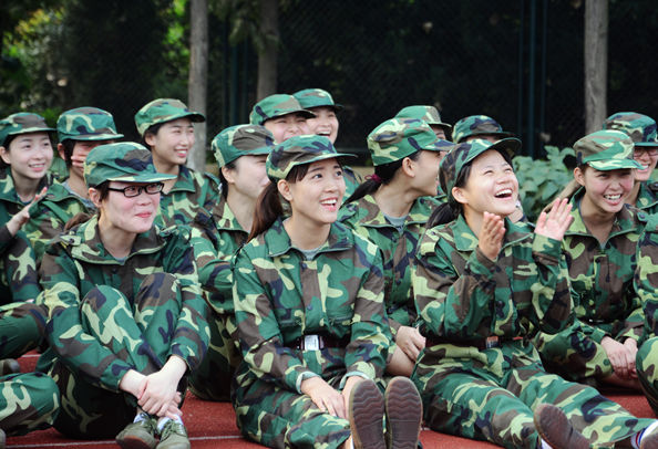 “稍息,立正,向右看齐——,教官洪亮的口令声一响起,整齐的小碎步便随之迈起,队形转瞬之间变得整齐划一,而后四周便安静得只剩下平缓的呼吸声了。整队完毕后,各连队便进入了站军姿、齐步、正步等紧张训练中。“虽然每次训练都很累,但这却使我认识了多人,令我很快乐、很开心。”外语系的严敏同学在休息期间这样说道,其实军训没有想象中的那么累,而且天气也不热。