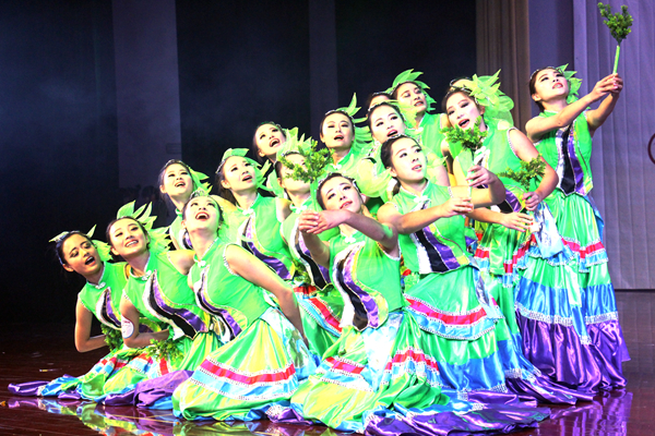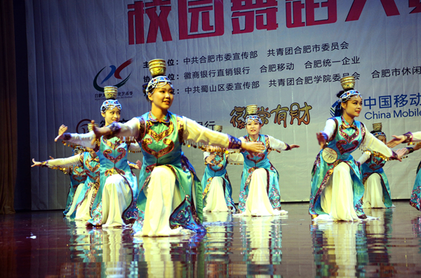 当观众还沉浸在激情四射的现代舞中时,我校舞蹈表演者们身着翠绿色传统衣裙,迈着优雅的舞步款款走来,柔美的舞姿宛如小荷才露尖尖角,挥动的舞袖仿佛绽放的花朵,生动表现了春雨动人的美感,古典舞《且吟春雨》将中国古代女子的恬静柔美,温婉动人表现得淋漓尽致。“细雨清风满竹林,几许飒飒嬉叶缕。惊雷震耳绕林间,醉竹弄雨似长情。”女舞者似细雨,男舞者似细竹,安徽医科大学带来傣族舞蹈《细雨醉竹》生动表现了洁净、吉祥、生命的主题,陶醉了全场。随后,一改前面古典舞的柔美缱绻,安徽艺术职业学院地舞者们用上升的力度、脚下的力量、后背的隆起表现泰山挑夫的质朴与担当,同时于粗狂中注入些许柔情,一支刚柔并济的中国舞蹈《脊梁》带给观众全新的视觉体验,引来全场观众热烈的欢呼声。另外,灵气十足的当代舞《水欢鱼跃》,欢快俏皮的维吾尔族舞蹈《摘葡萄的时候》,扣人心弦的顶碗舞《酒歌》等各具特色的舞蹈使人眼花缭乱,目不暇接,全场掌声雷动,经久不息。