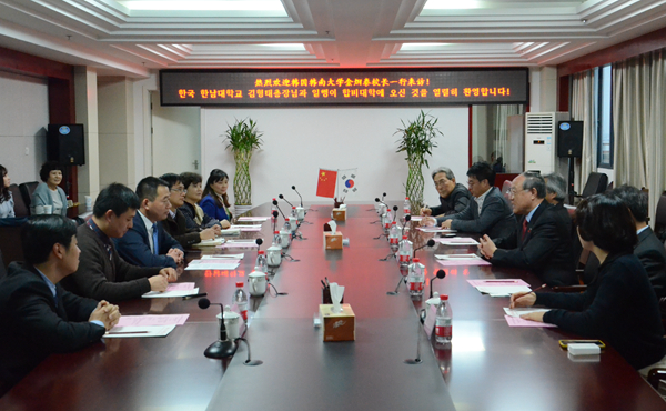 11月23日,韩南大学校长金烱泰、企划调整处处长郑明基、对外协力处处长李承護、国际交流处副处长金元培、中华圈合作主管崔知善、教授闵永大一行来访,我校党委副书记、校长张文兵在九楼东会议室热情接待了金烱泰一行。双方就中韩2+2合作项目等事宜进行深入探讨和交流。国际交流合作处副处长张慧、中国语言文学系党总支书记朱涛等陪同会谈。