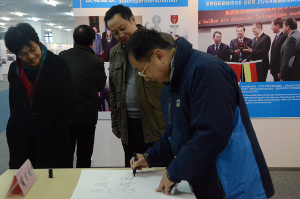 随后,蔡敬民陪同潘亚群一行参观了我校中德共建合肥学院三十周年成果展及体育馆。期间,蔡敬民对学校发展历程、中德合作项目、学生创新创业成果等方面作了详细介绍。