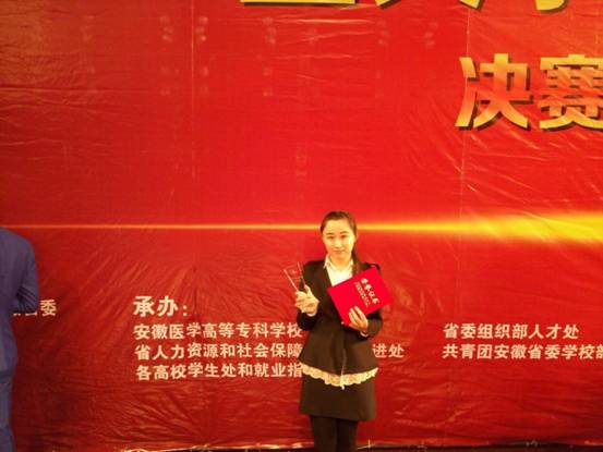 本届大赛由安徽省教育厅、安徽省人力资源和社会保障厅、共青团安徽省委联合举办,大赛分为就业组、创业组两个组别,自今年三月起在历时10个月的赛事期间,全省共有98所高校的共计10万多名大学生参赛。我校选手张丹丹同学在学校初赛、片区复赛中表现优异,突出重围挺入省赛。在省决赛中以其敏捷的思维与出色的舞台表达能力,结合自己的实习经历对未来自身的职业进行了精彩细致的规划,最终荣获大赛“就业之星”银奖称号。