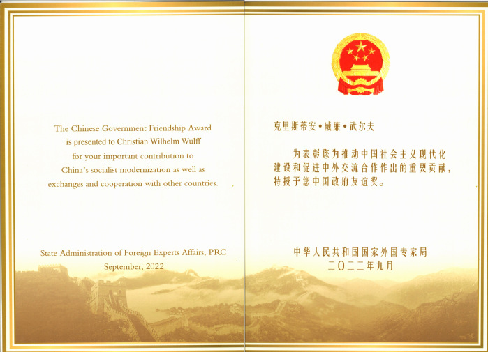 因在中德人文、教育、科技等领域友好合作做出卓越贡献,我校与同济大学联合推荐的克里斯蒂安·威廉·武尔夫(Christian Wilhelm Wulff)教授荣获2022年度中国政府友谊奖, 武尔夫教授成为我校历史上第五位获得中国政府友谊奖的外国专家。