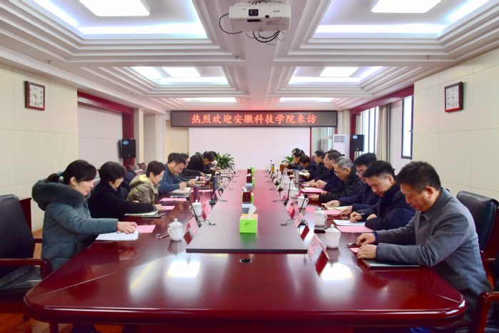 12月20日上午,安徽科技学院党委副书记、院长李震,党委委员、副院长黄远友一行来我校调研交流,我校在行政楼九楼东会议室召开调研座谈会,校长吴春梅出席并主持会议,宣传部、教务处、发展规划处、人事处、科研处、国有资产管理处等相关部门负责人参会。