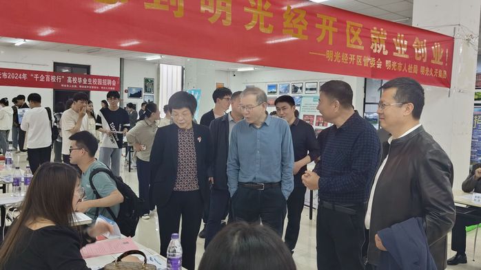4月15日下午,学校在图书馆一楼就业招聘大厅举办2024年合肥市工商联合会、明光市专场招聘会。党委书记王其东在学生处等相关单位负责人的陪同下到现场了解招聘情况,并与企业面对面交流。合肥市政协副主席、合肥市工商联主席姚亚妹、明光市人社局局长蔡峰等到现场考察。