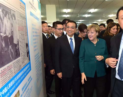 虽然展览只有200多米的路程,但两国总理一路聊一路看走了20多分钟。他们途径一间阅览室看到有学生自习,又折返回来走进去与围拢过来的大学生交流。李克强询问了学生们的学习情况,默克尔则用德语说:“祝你们在以后的学习中一切都好。”